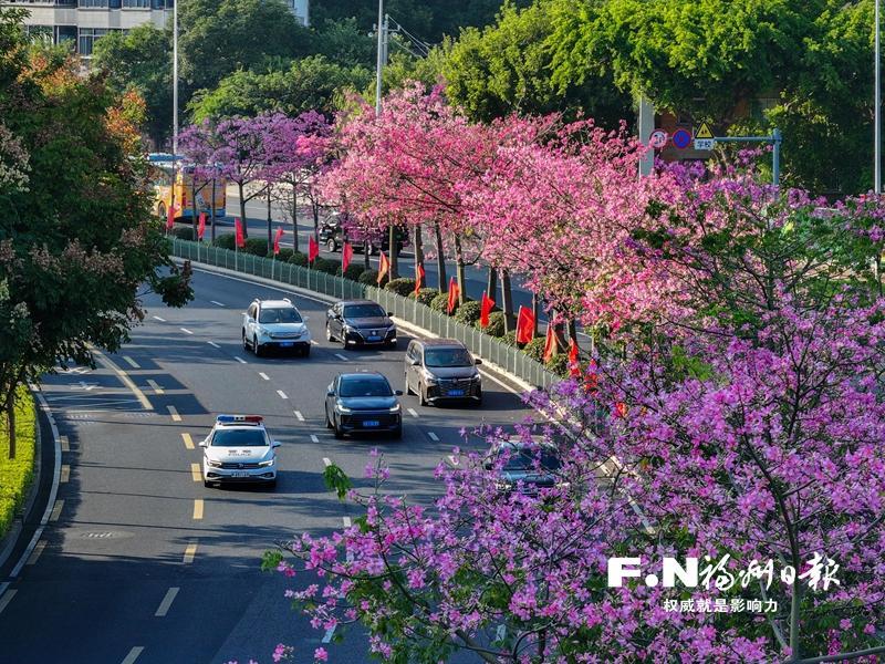 国货路上的美人树进入最佳观赏期。记者 包华 摄 从国庆长假开始,远洋路和国货东路的分车带上,300多株美人树进入盛花期,为福州增加秋日的浪漫。 远洋路和国货东路,是进出主城区的重要通道。这几天,不少经过这里的市民被粉色的街景所吸引。从国货东路的长乐中路路口,到远洋路的福光南路路口,粉色的美人树楚楚动人,赋予街道明媚和飘逸。 福州市绿化管理处相关负责人告诉记者,这些大树是七八年前种植的。当时,福州只有工业路等少数标志性花街。设计方期待这条主城区向东的通道,也能惊艳秋天,跻身城市地标。“今年的气候适宜,加上养护单位精确科学地施肥和修剪,为市民带来了这一美景。”上述负责人介绍道。 美人树是美丽异木棉的简称,以此和“英雄树”木棉相对应。园林专家告诉记者,从本月开始市区的美人树已经进入最佳观赏期,除了国货东路和远洋路,福飞路、鹤林路、南江滨东大道、南三环湾边大桥等地都能看到这种粉色花树的身影。(记者 石磊磊) |