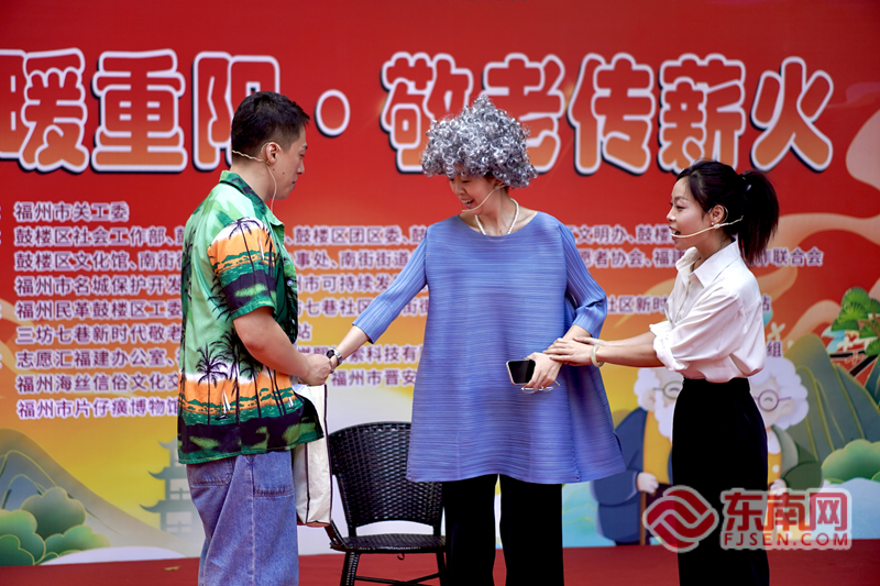 福建人民艺术剧院小品《见缝插针》。赵杨、郑晓龙供图 10月26日上午,南后街北口文艺汇演拉开帷幕。福建幼儿师范高等专科学校附属第二幼儿园孩子带来的开场鼓《盛世欢歌》,以稚嫩鼓点敲响节日序曲。随后,福州评话《扶贫谣》用醇厚乡音讲述闽山闽水间的温暖故事;福建人艺小品《见缝插针》揭露文旅领域违法漏洞,提醒老人防范诈骗;小柳小学学子朗诵《追忆烽火岁月,汲取前行力量》,纪念抗美援朝出国作战75周年,传递红色精神。此外,民族舞《王昭君》、武术《八极拳》、模舞《梅花赋》等节目轮番上演,校园杂烩汤乐队的歌曲串烧更将氛围推向高潮,不同年龄层表演者用多样形式诠释重阳内涵,展现传统文化魅力。