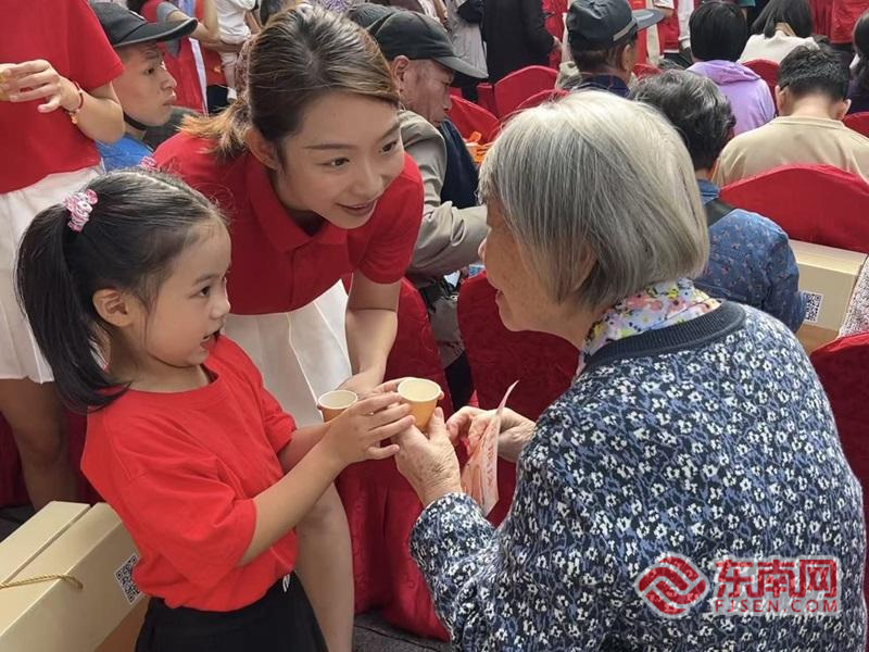 孩子向在场老人赠送菊花酒。三坊七巷社区供图 汇演现场互动温情满满,孩子们表演《爱的种子》后,亲手向在场老人赠送菊花酒,传递健康长寿的祝福;爱心单位为社区困难长者送上爱心物资,让关怀直达心间;现场还设置有奖问答环节,围绕老年人权益、反诈知识出题,答对者可获精美礼品,在互动中普及实用知识。