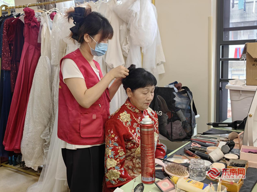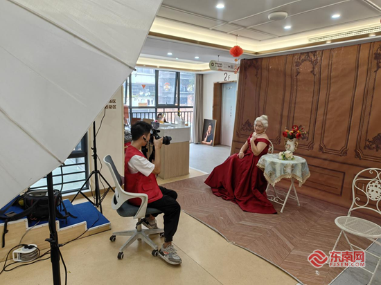 公益摄影现场。 活动现场精心布置了典雅旗袍、浪漫婚纱、华丽礼服等多样化拍摄服饰,满足居民个性化需求。专业化妆师团队提前到场,为每位参与者打造精致妆容,助力他们以最佳状态定格美好瞬间。拍摄过程中,两位摄影师尽显专业与耐心。不仅根据居民气质调整光影构图,更亲自示范拍摄姿势,用幽默互动帮助大家消除紧张感。