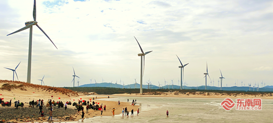 成排的白色风电叶片。 随后,大家前往长江澳风车田。海风轻拂,成排的白色风电叶片缓缓转动,与蓝天、碧海共同构成一幅和谐美丽的生态画卷。现场讲解员为长者们详细介绍了风力发电的原理,以及绿色能源对生态环境保护的重要意义。
