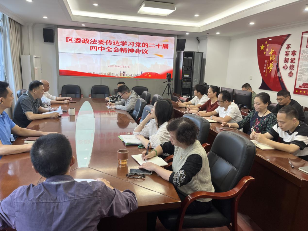 10月27日上午,区委政法委召开会议传达学习党的二十届四中全会精神。会议指出,学习好贯彻好全会精神是当前和今后的重大政治任务。会议强调,要完善社会治安防控体系,完善矛盾纠纷多元化解机制,提升综治中心规范化建设水平,维护全区安定稳定,提升基层平安建设水平。 区政府办
