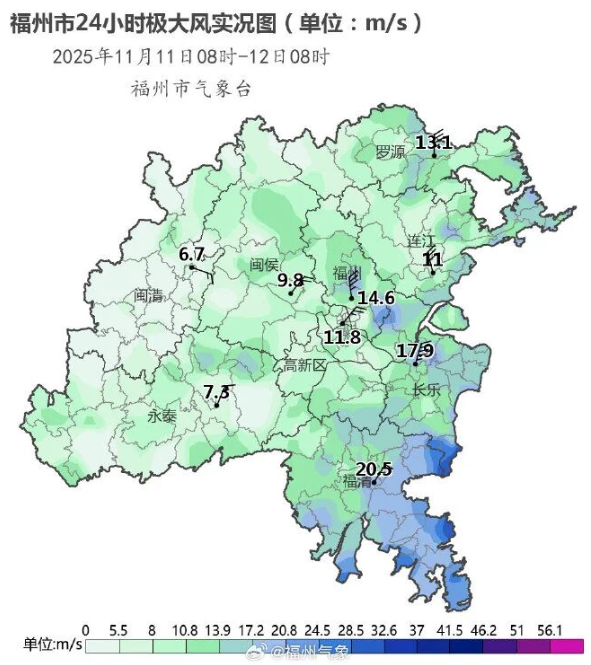 东南网11月12日讯(本网记者 朱琳)记者从福州市气象台获悉,受台风“凤凰”和冷空气的共同影响,11日白天至12日早晨,福州沿海地区及高海拔山区出现8~11级强阵风。其中,长乐区松下码头11级(风速:31.6米/秒)为最大;福州主城区(鼓楼乌山)最大阵风为6级(风速:11.8米/秒)。全市范围内出现小到中雨,局地大雨。