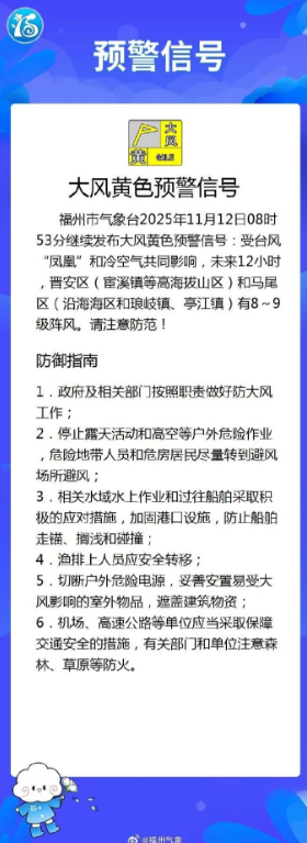 福州市气象台于12日8时53分继续发布大风黄色预警信号:受台风“凤凰”和冷空气共同影响,未来12小时,晋安区(宦溪镇等高海拔山区)和马尾区(沿海海区和琅岐镇、亭江镇)有8~9级阵风。请注意防范!