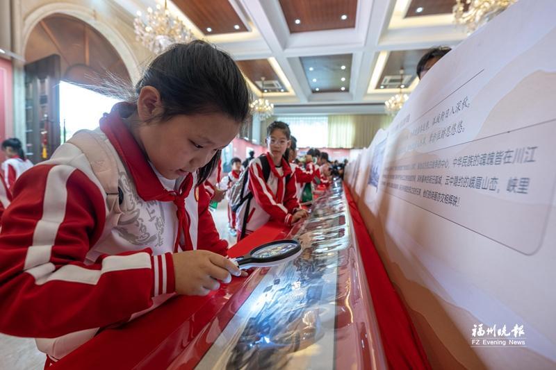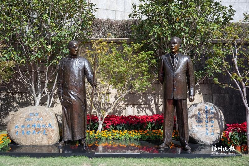 小朋友在活动现场认真观看《长江万里图》。 英雄之城铸丰碑 15日的三山陵园何遂吴石纪念广场,庄严肃穆。吴石孙女吴红、何遂长孙何代宁缓步上前,轻轻擦拭着两位先辈的塑像,全场静默无声。阳光下,塑像熠熠生辉:吴石目光坚毅,眺望远方,底座“凭将一掬丹心在,泉下嗟堪对我翁”的题字彰显赤诚;何遂神态从容,拄杖而立,“收拾乾坤归腕底,吾辈固应如是”的字句尽显风骨。塑像间,海鸟在浅浅的海峡上自由翱翔,寄托着对祖国统一的深切期盼。 这片纪念区域底蕴深厚:毗邻的邓子恢、陈兰夫妇雕塑静静矗立,周边环绕着福州抗日志士纪念墙、中山舰福州籍抗日将士之碑,每一处都镌刻着英雄之城的红色记忆。 这尊目前唯一经两家后人共同授权、参与创作并最终认可的塑像,从倡议到落成历时两年,承载着几代人的心愿。“2017年冬日的北京医院病房,何康听闻要为二位将军塑像,眼含热泪说道:‘吴伯伯与家父乃生死至交,受其影响我投身革命,今日能在故乡为他们立像,精神永传,意义非凡!’”福州三山人文纪念园董事长林军分享的往事,让现场不少人动容。为促成此事,何遂之孙何巍积极联络远在美国的吴石之女吴兰成,94岁的何康郑重签署征求意见函,吴兰成也签署同意意向函,特别强调塑像“须真实反映父亲生平气质”。 2019年10月22日,“致敬英雄”塑像落成揭幕仪式在三山人文纪念园举行,两位福州籍革命先辈的英魂,终于在故乡的土地上安然永驻。吴红动情地说:“福州是英雄辈出的城市。这一次我回到福州了解到了更多烈士的故事,在他们身上我看到了福州为祖国的解放事业作出的巨大贡献,福州对得起‘英雄福州城’这一称号。”