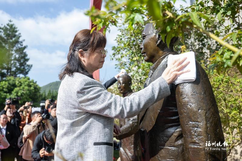 吴石孙女吴红轻轻擦拭着吴石塑像。