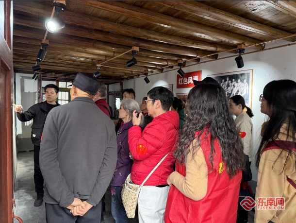 随后,党员们前往革命老区村——莲宅村。这座因后山形似倒蒂莲花而得名的村庄,如今已成为省级乡村振兴示范村,红色基因与乡村振兴的活力在此交融共生。在闽中游击支队莲宅联络总站旧址桂堂厝,党员们参观了以《秘密使命》为主题的红色展陈,通过详实的史料、鲜活的故事,系统了解了1947年中共闽浙赣省委在此建立联络总站,发展13个分站,构建起覆盖闽清的地下情报网,开展掩护同志、筹措经费、组织游击队等革命工作的光辉历程。讲解员介绍,为厘清这段秘密历史,村里耗时两年多收集整理资料,让沉寂的革命故事重焕生机,这让党员们对“挖掘红色资源、传承红色精神”的重要性有了更深刻的体会。