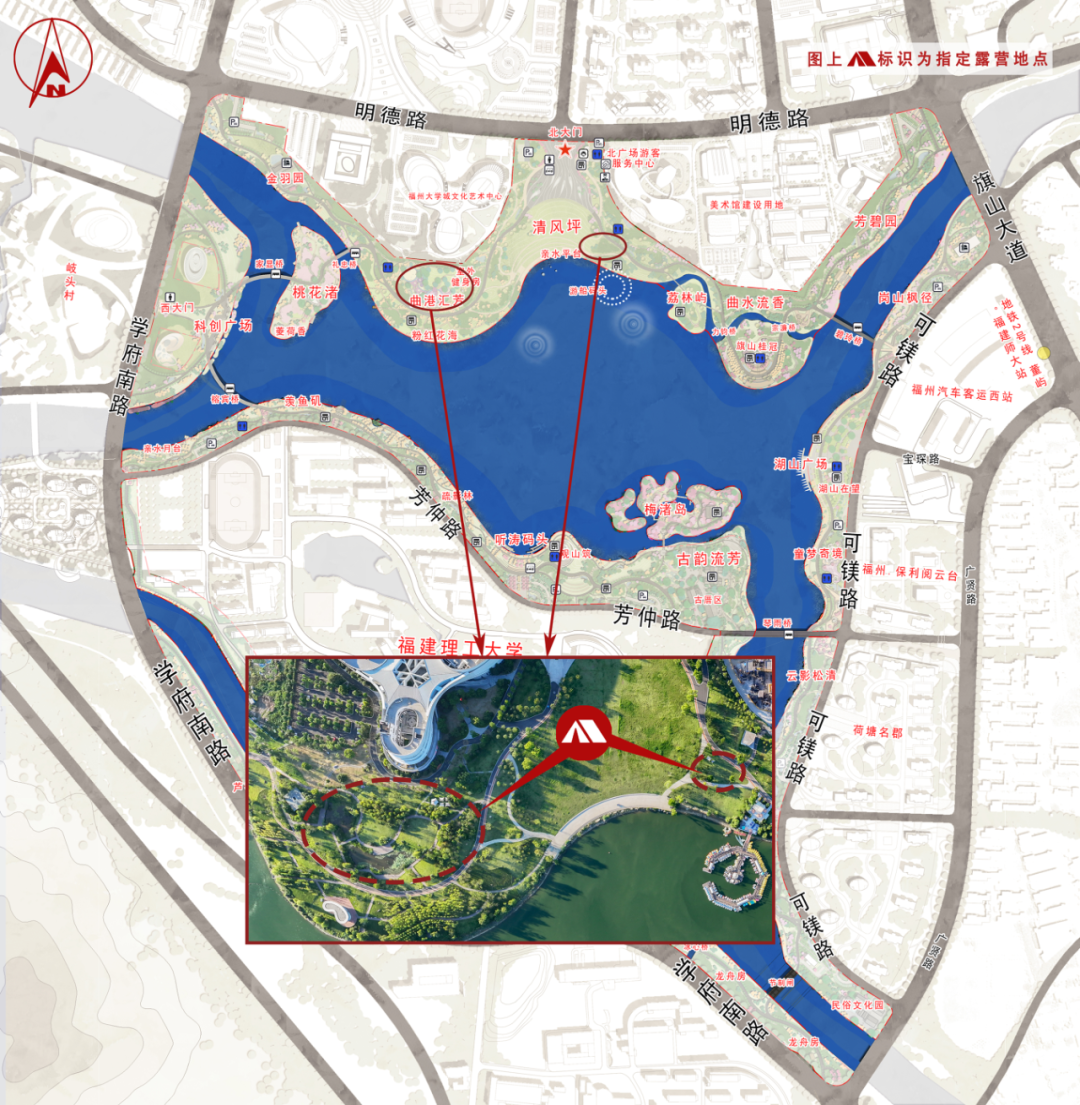 因镇海楼双龙浮雕修复工程需要,我馆于2025年12月2日至2025年12月16日围挡施工,施工期间将关闭镇海楼登楼楼梯、镇海楼一楼观景平台与福州古厝展示馆。为了您的人身安全,请市民朋友切勿进入围挡施工范围。 由此带来的不便敬请谅解,感谢各位市民朋友的理解与配合! 2025年12月1日 福州市鼓楼区博物馆 旗山湖公园古厝露营区域 暂停开放公告 12月3日起,旗山湖公园这块露营地暂停开放。 暂停开放通知 尊敬的游客朋友们: 因福州旗山湖梦幻灯光节将在旗山湖公园南面区域(靠古厝停车场前草坪区域及梅渚岛)开展,根据筹备及举办需求,古厝露营区域自12月3日起暂停对外开放,具体恢复开放时间以官方后续通知为准,敬请关注。 此次古厝露营区域暂停开放给您带来的不便,我们深表歉意,暂停期间,您可前往公园其他露营区域畅享休闲时光。 福州旗邑文旅发展有限公司 2025年12月1日 目前旗山湖公园中,有2处免费露营区域,分别是曲港汇芳区域、清风坪附近。