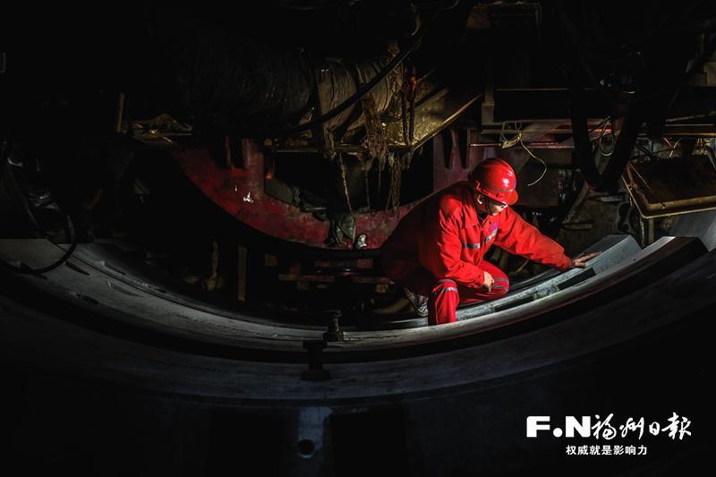 盾构机操作人员在狭小艰苦的施工环境下工作。记者 陈暖 摄 更换刀具400余把 破解复杂地质建设难题 回顾地铁4号线后通段的建设历程,充满着种种挑战。这段短短的线路,却有江底穿越复杂地质、超大深基坑施工两大建设难题。 金牛山站至洪塘站区间恰好处于两条地质断裂带交汇处,隧道断面内包含21种不同地层、66种地层组合形式,地质条件十分复杂,盾构机需攻克由坚硬正长斑岩构成的“三座大山”,岩石强度最高达203.8兆帕,是国内罕见的高难度盾构区间。 为此,福州地铁邀请院士和知名专家“把脉问诊”,组织人工累计带压进仓作业超3400次,更换刀具400余把,通过应用超前地质预报、江面注浆加固、优化盾构机参数等一系列技术与机制创新,最终成功下穿闽江。