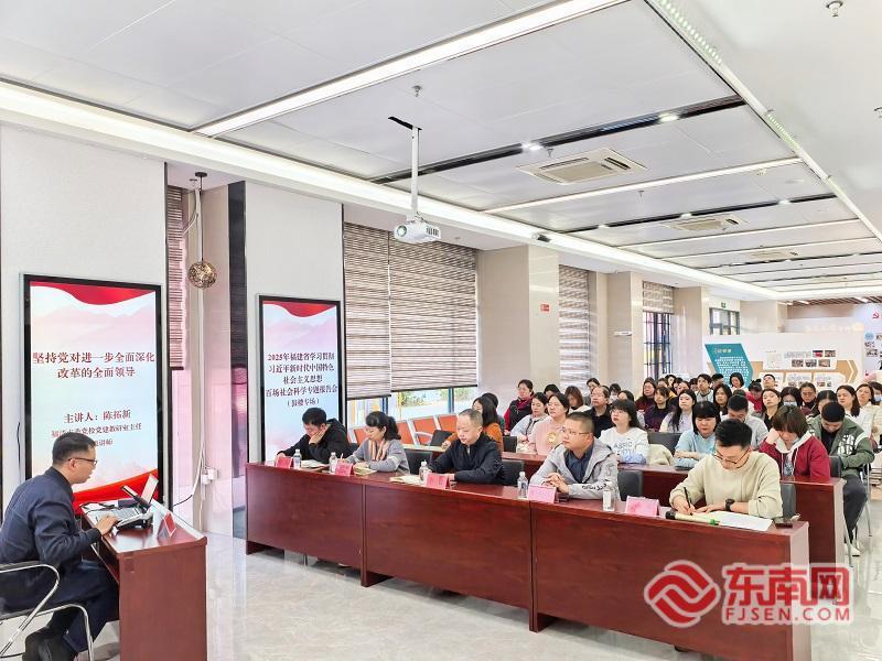 报告会现场。汤边社区供图 本次报告会特邀福清市委党校党建教研室主任、高级讲师陈拓新,作题为《坚持党对进一步全面深化改革的全面领导》的专题宣讲。街道社区干部、辖区统战成员代表、单位代表、人才代表等到场聆听学习。 报告会上,陈拓新围绕深刻认识党对进一步全面深化改革的全面领导的重大意义、提高党对进一步全面深化改革的全面领导水平的实践要求等两大方面,结合具体案例,进行了深入浅出的讲解,引导街道社区干部及统战成员准确把握进一步全面深化改革的战略部署,深刻领会各项改革举措的内在逻辑,从而明确基层落实方向,切实推动改革任务在社区层面落地见效。
