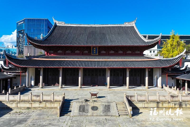 福州文庙大成殿。 暖阳下的圣庙路,红墙围合的福州文庙内,新铺的瓦垄整齐排列,折射出温润的光泽;两侧廊庑再现往日颜色,尽显庄严肃穆。这座始建于唐初,唐大历八年(773)从城西北移建今址的福州文庙已完成修缮,通过市文物局初验,下周二(12月16日)开始重新对公众开放。作为福州文脉的核心载体,这座古建的每一处构件都镌刻着闽都文教的兴衰,每一次修缮都延续着文明传承的脉络。