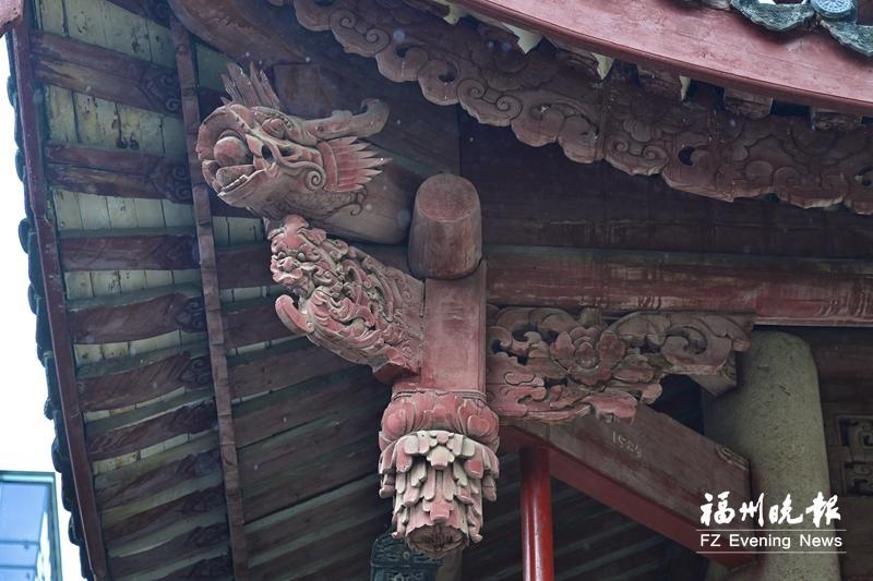大成殿精美的木构件。 屋面修缮是此次工程的重点和难点,在福州本地文山古砖窑停烧之后更是“难上加难”。“现在有很多合成材料烧制的瓦用于古建筑修缮,但是颜色和功能都难企及旧瓦,修缮大成殿用的瓦还是要延续本地工艺特性的。”邱守廉说,正在大家一筹莫展的时候,施工队揭瓦后发现,20世纪七八十年代修缮的那批瓦上留下了“宫辉砖瓦厂”的标志,这让大家欣喜若狂。福州市文物局文修处负责人与专家一行立马奔赴苏州市宫辉砖瓦厂,在一番考察之后确定这就是文庙修缮需要用到的瓦,于是,今年3月定烧,分三次窑烧,陆续运回福州用于修缮。 “这就是我们常说的‘文物会说话’。不同时代的历史信息都会在文物上留下痕迹。”邱守廉介绍,大成殿的重檐歇山顶坡度陡峭,原本就采用双层瓦铺就的“底瓦+盖瓦”结构以增强防水性。此次修缮中,施工队不仅延续了这一传统工艺,还吸取安徽凤阳古建筑瓦片滑落事故的教训,在每3块瓦片下的椽、望板上额外钉上2颗铸铁方钉,以更好地固定瓦片。“这其实也是老祖宗的智慧,古代工匠已经在这里用了含碳量很高的铁钉,我们的做法只是起到替换加强的作用。”邱守廉说。 从屋面揭瓦勘察到木构架加固,从墙体裂缝修补到地面条石更换,这场修缮耗时一年多。“急不得,也快不了。”古建专家们反复强调,古建筑修缮就像给老人治病,要耐心细致。暴雨侵蚀的痕迹、夜猫造成的损坏、台风留下的隐患,都需要逐一排查治理。正是这份坚守,让大成殿逐渐褪去岁月的沧桑,重现往日的恢宏气势。