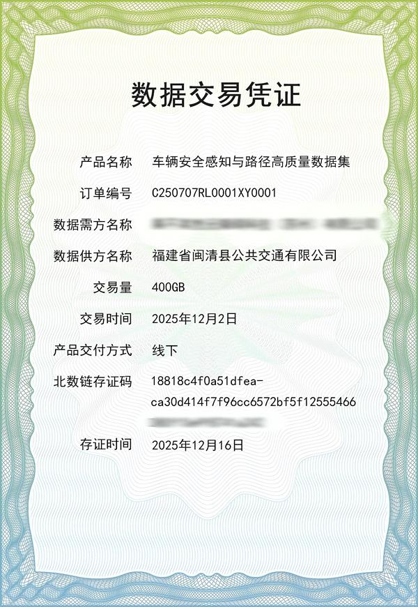 数据交易凭证。 数据作为新型生产要素,其价值释放已成为全方位推动高质量发展的重要引擎。闽清县委、县政府深刻把握这一历史机遇,主动担当作为,将闽清公交公司列为数据资产化改革的先行试点。 此次改革突破,得益于清晰的顶层设计与高效的执行路径。在县政府的统筹指导下,闽清县财政局牵头建立了跨部门协调机制,为数据资产的合规确权、评估入表扫清了制度障碍。作为改革实施主体,闽清公交公司积极拥抱转型,将历年积累的海量公共交通运营数据,包括线路流量、客流分布、车辆调度等核心信息,进行全面系统地梳理与盘活。 专业力量的注入是成功的关键。国内领先的数据服务机构中启联信科技集团,凭借其在数据要素市场领域的深厚积淀,为闽清公交提供了从方法论到实操的全链条专业服务。项目团队严格遵循国家数据安全与个人信息保护法律法规,完成了数据资源的合规性审查、质量评价与价值测算。经过严谨的评估流程,闽清公交首批核心数据资产被确认为价值超过300万元的企业资产,顺利计入资产负债表,实现了从“无形资源”到“有形资产”的质变。 数据资产化的真正价值在于流动与交易。闽清此次改革的突出亮点,在于成功跨越了“入表”与“交易”之间的鸿沟,打破了以往数据资产“有价无市”或仅在账内体现价值的困局。 项目团队将经过标准化、脱敏化处理的数据产品,推送至国家级数据交易平台——北京国际大数据交易所进行挂牌。该平台以其权威的公信力、规范的交易规则和活跃的市场生态,为数据要素的高效合规流通提供了坚实基础。17日,闽清公交数据产品在该所成功完成首笔场内交易,这不仅是福建省县域公交数据产品的“破冰”交易,更意味着闽清的数据资产获得了全国性高端要素市场的认可,真正实现了从“静态资产”到“流动资本”的关键一跃。