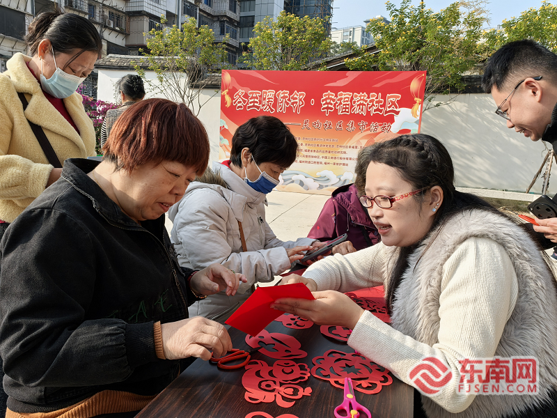 剪纸体验。 集市活动现场精心设置民俗体验、便民服务专区。民俗体验区里,厨师与居民携手揉面、包馅,在欢声笑语中分享南北冬至习俗;民俗手作摊位上,剪纸体验项目吸引众多居民、小朋友参与,民间艺人现场指导,让大家沉浸式感受传统手工艺的魅力。