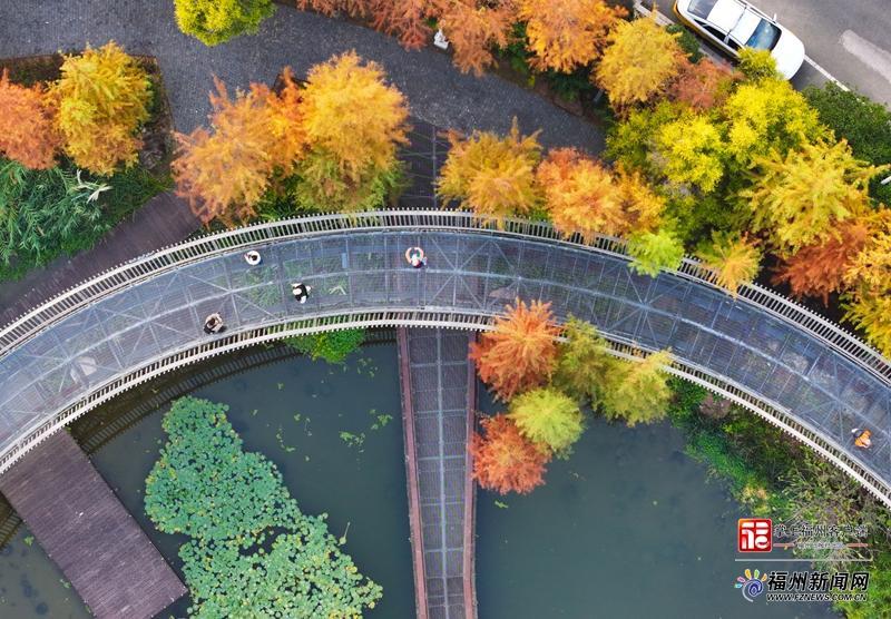 记者在梅峰山地公园内看到,成片池杉沿栈道蔓延,灿烂的黄、热情的红、青翠的绿相互交织,构成了一幅五彩斑斓的画卷。沿着福道在半空俯视,一层层铺展开来的池杉衬着清澈的湖水,宛如一幅浪漫华美的油画。 来自东北的游客周先生正和家人沿着小道漫步,他告诉记者,此次来福州特地避开热门景点,来打卡这片池杉林。“做攻略时看到网友推荐这里,实地过来果然没失望,池杉林与湖水相互映衬,比想象中更有诗意。” “目前池杉变色率已达五成以上,12月底将进入最佳观赏期,预计可持续至明年1月中旬。”公园管理人员介绍,随着天气转凉,后续池杉颜色还将愈发浓郁,观赏体验会进一步提升。