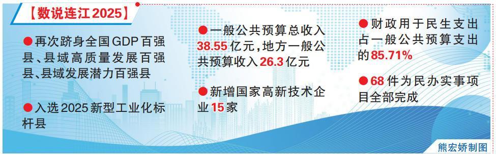 锚定实体,夯实强县之基 现代化产业体系,需要实体经济为支撑。2026年,连江将夯实壮大实体经济根基,让实体经济成为连江产业发展的核心支撑。 聚焦种业振兴,推动水产种业工程中心建成投用,深化养殖海权改革,做强特色海产养殖,力争新建深远海生态养殖平台3台套,筑牢渔业发展“芯片”。 发力全链升级,完善国家远洋渔业基地配套,推动母港一期、国际水产品交易中心等项目建设,支持达诚水产、正冠磷虾园等项目投产,构建“捕捞—加工—贸易”一体化产业体系,力争远洋捕捞产量突破20万吨。 突出品牌引领,充分发挥县海洋渔业协会资源整合作用,破解精深加工瓶颈,加快连江鲍鱼国家地理标志保护示范区建设,探索海洋碳汇开发,推动产业从“分散经营”向“集群发展”跃升,让“世界渔都”城市名片更加闪亮。 向新而行,点燃创新引擎 在向“新”而行的路上,连江将以科技创新推动产业创新,塑造发展新动能新优势。 建强创新平台——2026年,连江将深化“政产学研金”联动,支持福州大学电子化学品新技术产业园、恒申全球研发中心、海洋食品研究院等平台建设,争取中韩海洋科创产业园落地,构建支撑有力的县域科创体系。 激活人才引擎——2026年,连江将迭代升级“海连江·人才港”政策,打造卓越企业家、工程师和工匠队伍,探索建设海峡青年发展型县域,支持企业建立博士后科研工作站、专家工作站,让更多“千里马”在连江竞相奔腾。 加码数字赋能——2026年,连江积极融入数字中国建设综合试点,力争数字经济规模突破350亿元。全面实施“人工智能+”计划,重点打造“人工智能+海洋”创新应用场景,争创全国海洋渔业数据资产应用标杆。 项目为王,蓄积源头活水 作为拉动经济增长“三驾马车”之一,投资在扩内需、促发展中发挥着重要作用。明年,连江将以有效投资作为高质量发展的关键抓手。 招商引资“强磁场”。深化“五全”抓招商工作机制,新引进50亿元以上重大产业链项目1个以上、5亿元以上重点招商项目13个以上。新引进优质台资项目10个以上。 项目建设“加速度”。全力攻坚总投资超1300亿元的138个重点项目,提速温福高铁(连江段)、可门作业区泊位、华润海上风电等“硬支撑”建设。 要素保障“再强化”。强化与中金资本、红杉资本、科技部创新基金、国家绿色发展基金等合作,用好产业基金。持续深化小微企业融资协调工作机制,搭建政银企常态化对接平台。 改革攻坚,澎湃开放动能 开放融通的潮流滚滚向前。迈入新时代,连江将继续以改革攻坚、开放合作作为破题突围的重要路径。 加大对外开放力度。加快整合可门港、黄岐港、国家远洋渔业基地等港口资源,培育发展期货交割、航运金融等新业态。推动境内外跨区域口岸通关合作,打好新时代新“侨牌”。 推进重点领域改革。深化要素市场化配置改革,进一步做优增量、盘活存量。深化国资国企改革,提升核心竞争力。深化零基预算改革,加强产业工人职业技能培训,促进产业工人成长成才。 营造一流营商环境。以数字改革为牵引,探索利用人工智能大模型优化审批服务,打造能办事、快办事、办好事、办成事的“便利连江”。深化“渔业经营一件事”集成服务,推动惠企政策“免申即享”。 连马融合探新路。加快推动福州马祖产业合作园区落地,深化产业合作。适时加密连马航线,加强民间文化交流,支持台胞融入本地社区治理,建设两岸融合发展示范区“连江样板”。 优化布局,绘就山海新卷 新的一年,城市更新、乡村振兴将是连江空间优化的强大引擎。 城市品质持续完善。全面融入福州都市圈,着力建设创新、宜居、美丽、韧性、文明、智慧的现代化人民城市。谋划打通马祖东路等断头路,提速青塘湖公园建设,新增一批口袋公园。 乡村振兴全面推进。严守耕地红线,建设高标准农田2000亩以上,因地制宜发展绿茶、禽蛋、茶油等特色农业产业,新创建省级乡村振兴示范镇村6个以上,市级以上“一村一品”专业村6个、农业产业强镇1个。 坚决守护生态底色。深入实施《美丽连江建设行动方案》,加强敖江流域综合治理与湿地保护,打造东岱山堂生态观鸟示范基地。以安凯乡为试点完善海漂垃圾治理机制,争创更多“美丽海湾”,让“蓝天碧水净土”成为连江最靓丽的底色。 以文化人,涵养千年文脉 2026年,连江将围绕多维发力激发文化活力,实现社会文明程度明显提升。 以文润心,绘就文明底色。连江将深入开展“我们的节日”“周末学苑”等系列活动,重点培育一批新时代文明实践站。开展图书阅读、文艺演出、科普活动等流动文化服务,优化推进图书馆、博物馆、美术馆、科技馆延时错时开放服务。 以文铸魂,守护文化根脉。2026年,连江将深入挖掘温麻文化、海洋文化、海防文化、红色文化、畲族文化等内涵,实施透堡孟季房祠等文物修缮工程及活化利用,持续推进魁龙坊历史文化街区等活化利用。 以文赋能,激发文旅活力。新的一年,高标准提升贵安温泉旅游度假区、环马祖澳滨海旅游度假区品质。谋划青芝山风景名胜区品牌重塑。提升“福炉里”热度,做好“茶文旅”文章。 心系民生,擦亮幸福底色 坚持发展为了人民,连江用心用情用力解决好群众急难愁盼问题,不断增进民生福祉。 筑牢民生保障网。实施就业优先战略,全年开展招聘活动80场