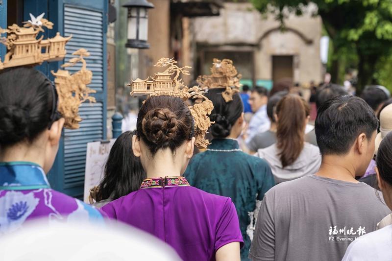 头戴软木画头饰的游客行走在上下杭街区。记者 林双伟 摄 “跨界不是简单嫁接,而是让非遗融入当代审美。”非遗代表性传承人林清韵认为,软木画的走红证明,传统技艺只要找到与现代生活的连接点,便能焕发新活力。 更令人瞩目的是福州传统梳妆技艺“三条簪”的出圈。作为市级非遗代表性项目,其蕴含的福州女性“爱国爱家爱己”的精神被深入挖掘,通过邀请知名艺人体验妆造,全网相关话题累计播放量超15亿次,获新华社全版专题报道,带动全国80余座城市的旅拍商家推出相关体验项目。 从三坊七巷到烟台山,头戴“三条簪”的游客成为街巷中流动的风景,衍生出的卡通IP“福宝”及冰箱贴、创意咖啡等文创产品,让非遗从妆造经济延伸至演艺、文创多领域。 此外,佛跳墙毛绒玩偶、牛角簪等爆款文创产品年销售额突破千万元。上下杭、三坊七巷等街区结合节庆推出非遗市集,百余个摊位汇聚非遗技艺与文创产品,让市民游客在互动中感受文化魅力。 沈绍安漆艺博物馆的漂漆体验、罗源下湖村的漆器乡村旅游,更让非遗在跨界中实现文化价值与经济价值的双重提升,“‘三条簪’非遗IP:培育‘非遗+国潮’文旅消费新活力”以及“沈绍安漆艺博物馆:城市文化客厅的全球叙事”2个项目成功入选2024“非遗融入现代生活”典型创新实践名单。 不只软木画、“三条簪”,福州油纸伞、脱胎漆器等非遗也纷纷走出深闺。从时尚秀场到文创市集,从家居装饰到伴手好礼,福州非遗正以润物细无声的方式,融入人们的衣食住行,成为彰显城市文化品位的新符号。
