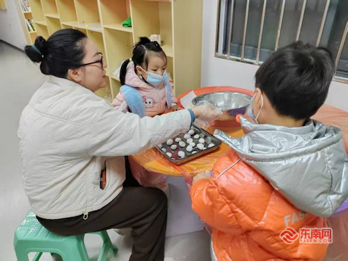 现场“搓汤圆”。杨桥河南社区供图 活动在温馨的“搓汤圆”环节中拉开序幕。家长和孩子围坐在一起,纷纷挽起袖子,揉面团、包馅料,合作搓制汤圆。现场气氛轻松活泼,无论是专注揉捏的孩子,还是悉心指导的家长,人人脸上洋溢着笑容,共同体验着手作的乐趣与温情。