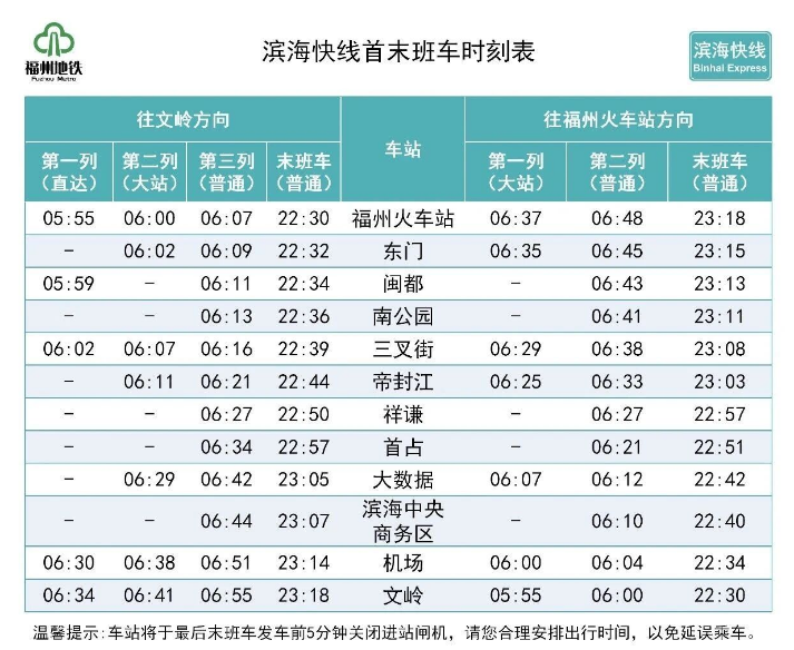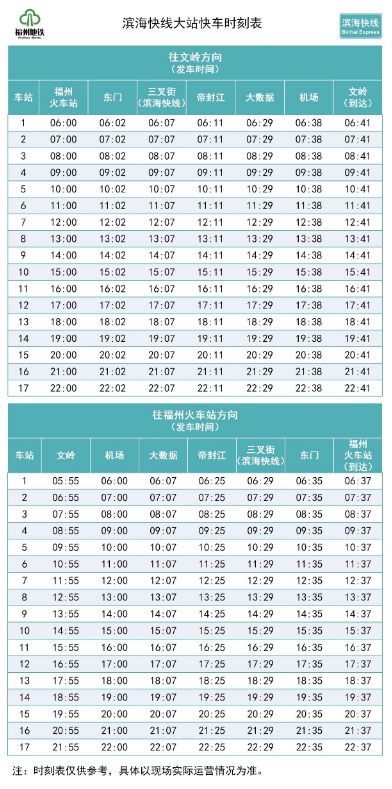 滨海快线原6:00直达快车提早至5:55,由福州火车站始发,中间增加停靠闽都、三叉街(滨海快线),其余沿途不停站,直达机场,终到文岭;取消原6:15始发直达快车。此外,自6:00起,整点开行大站快车,由福州火车站、机场对向开行,大站快车停靠站点不变,仍为途中停靠东门、三叉街、帝封江、大数据。之后,双向开行普通列车,停靠所有车站,行车间隔保持7分30秒不变。