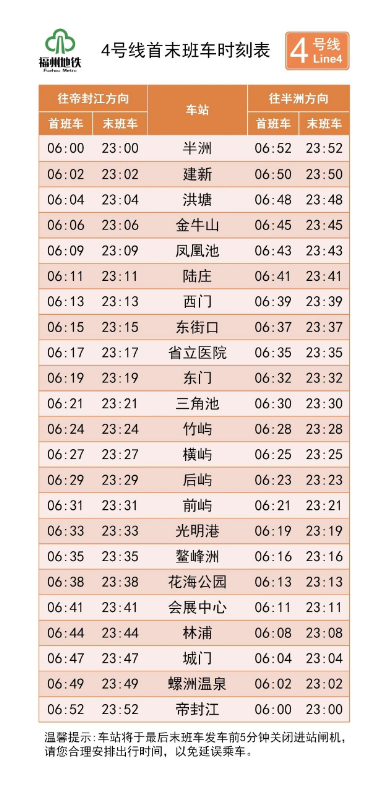 4号线首班车始发时间提早至6:00,由半洲、帝封江两端始发,末班车始发时间保持不变;