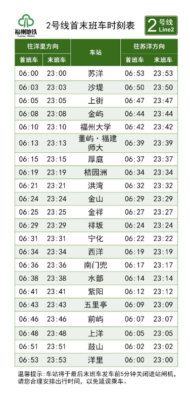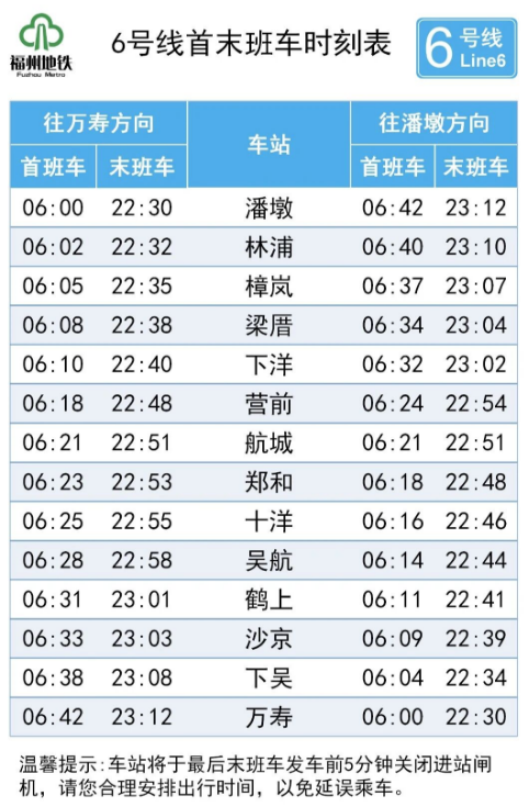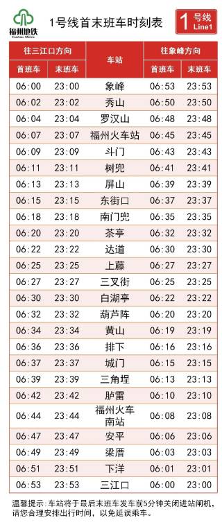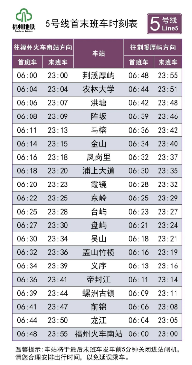 5号线首班车始发时间提早至6:00,由荆溪厚屿、福州火车南站两端始发,末班车始发时间保持不变;