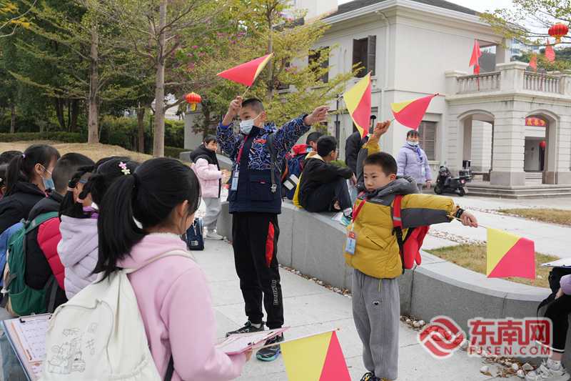“旗语传信”体验。灵响社区供图 手作创作与红色致敬环节深化精神传承。学生们以平结为主、蛇结与斜卷结为辅,将船锚、罗盘等海洋元素融入挂饰设计,用蓝红绳线寄托对海洋与热血的理解,让精神信物承载初心使命。在马江海战纪念馆,学生们借助沙盘推演、实景复原,直观感受近代山河破碎的悲壮历史,对比当下强国盛世,深刻领会严复“自强保种”理想的当代价值,围绕“新时代的血性”展开的讨论,展现出少年对时代使命的坚定回应。
