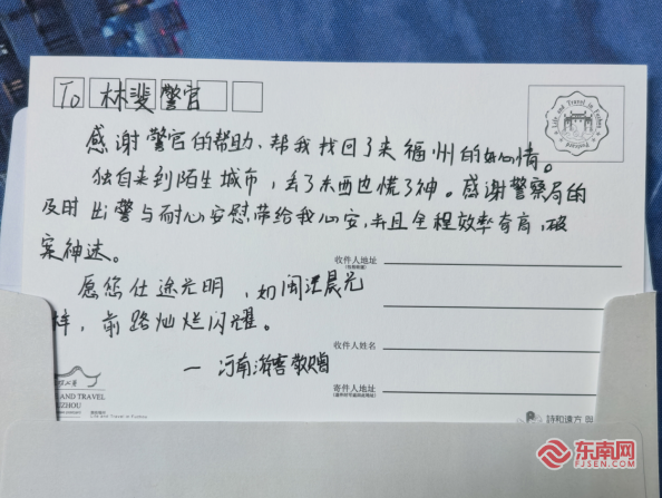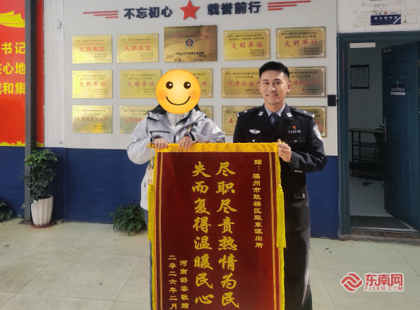 东南网2月13日讯(本网记者 通讯员 戴涛)近日,来自河南的游客张女士满怀感激之情,将一面印有“失而复得温暖民心 尽职尽责热情为民”的锦旗和一封手写的深情感谢卡,送到了福州市公安局鼓楼分局鼓东派出所民警林斐手中,对民警尽职尽责、高效帮其找回遗失的重要背包表示衷心感谢。