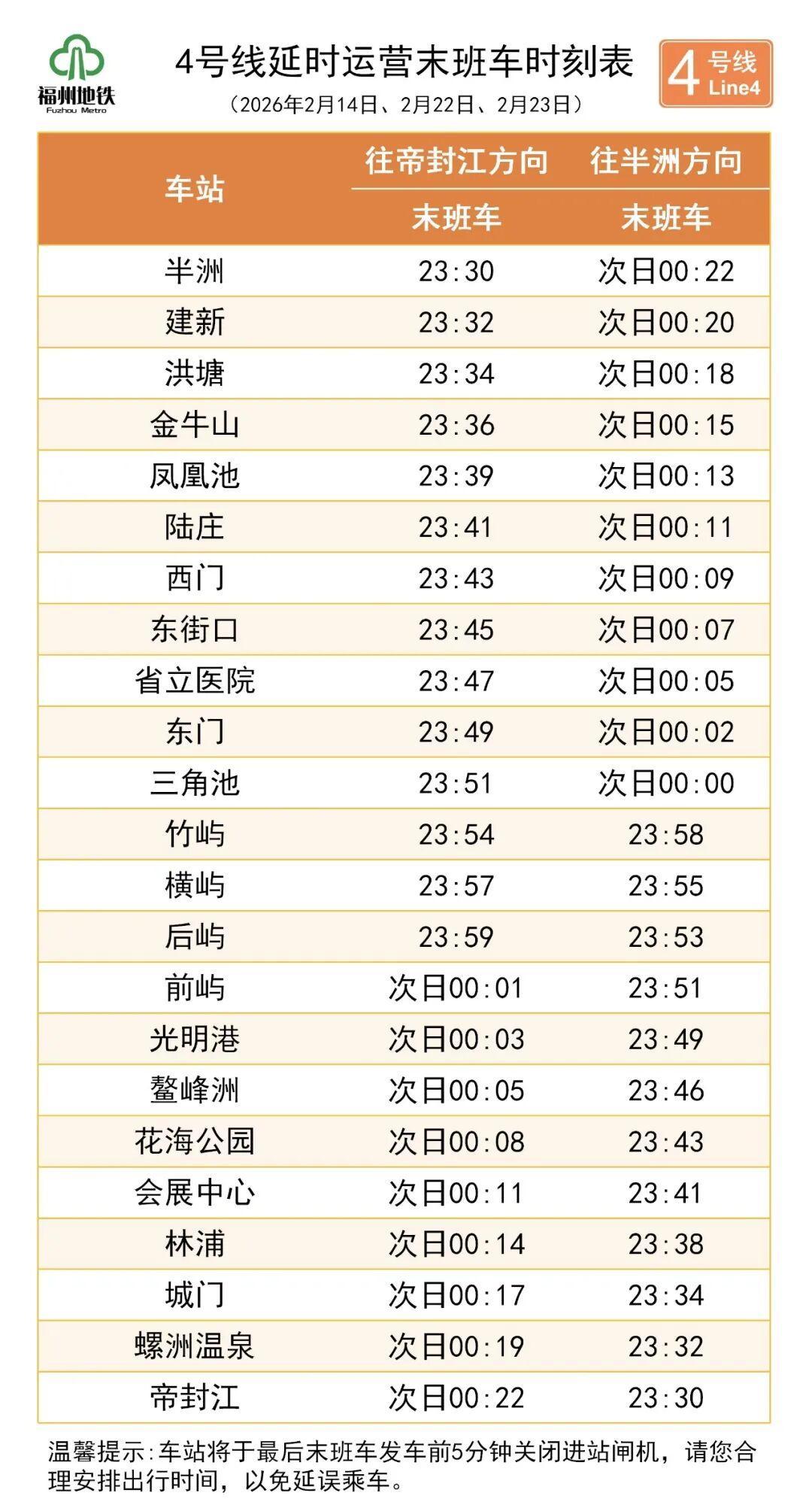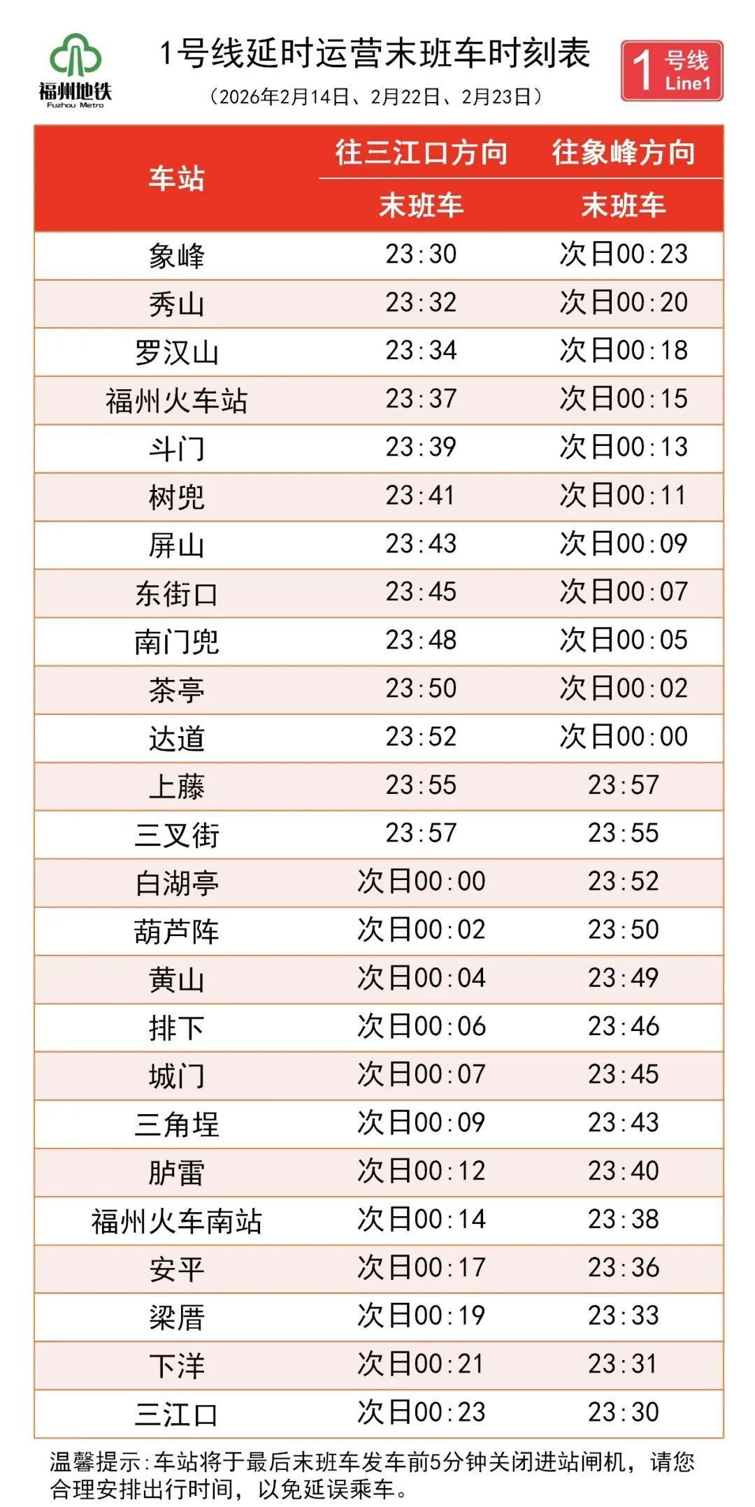 为保障市民乘客,春节假期前后便捷出行,福州地铁将通过延时运营、延长高峰、增加运能等方式,让您的旅途更顺畅、更安心。 延长运营时间,深夜守候温暖归途 2026年2月14日(腊月廿八)、2月22日(正月初六)及2月23日(正月初七)三天,1号线、2号线、4号线、5号线、6号线以及滨海快线,运营末班车统一延至23:30始发,延时运营期间各线路行车间隔为10分钟。