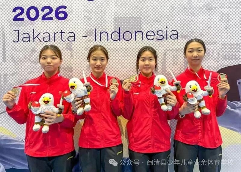 左二:焦恩祺。 2月27日,2026年亚洲青年击剑锦标赛圆满收官,由闽清县少体校输送的运动员焦恩祺,在女子花剑团体决赛中与队友携手夺得女子团体金牌。