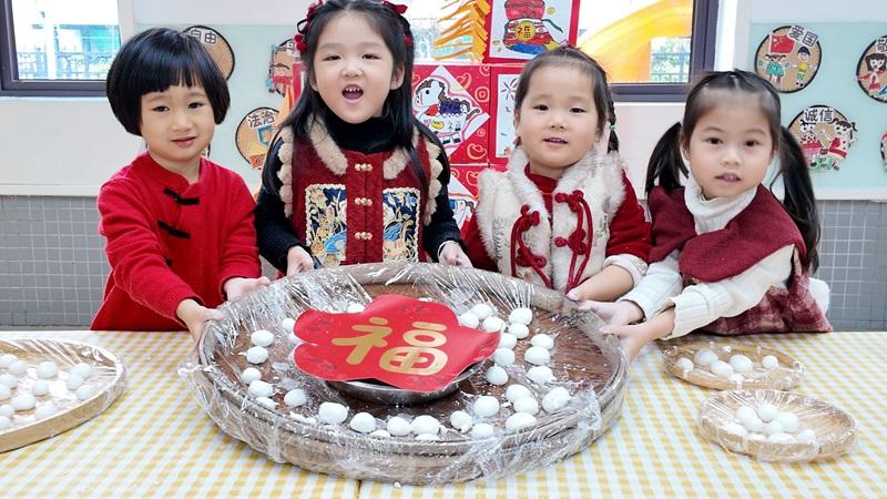 孩子们展示搓好的汤圆。 3月3日元宵佳节,闽清县第二幼儿园组织了一场别开生面的庆元宵活动。孩子们在老师的陪伴下,亲手搓汤圆、欣赏各式花灯、竞猜趣味灯谜,将一盏盏莲花许愿灯轻轻放入水中,寄托纯真美好的心愿。