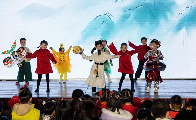 幼儿表演《李白与元宝》。胡艺 摄 草坪音乐会上,吉他的轻快、小提琴的婉转、电钢琴的灵动交织在一起,老师、家长与孩子们轮番登台,用歌声传递快乐,用旋律寄托祝福。