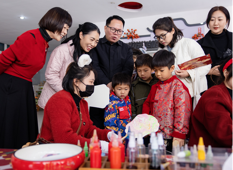 漆扇体验。胡艺 摄 开幕式上,鼓舞、快板、诗词吟诵、科学实验秀、幼儿茶艺表演等精彩节目轮番上演,尽显传统韵味与科创魅力;福建幼高专副校长陈凤玉致辞送祝福,吴丽珍园长分享活动初心与期许,家长代表、历届毕业生代表也送上了诚挚祝愿。在全场倒计时的欢呼声中,领导、嘉宾代表共同放飞气球,正式启动福幼二园第十届智趣灯笼节。 上篇・古韵新风 庙会游园乐翻天 全园师幼、家长同心筹备灯笼节庙会游园。孩子们化身“庙会小主理人”规划场馆、设计指南,以“小工匠”之手制作福马挂饰、挂灯笼、贴窗花,和老师、家长一同装点园区,家园携手让幼儿园年味满溢。