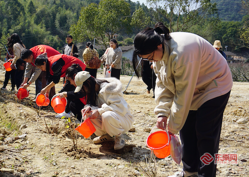 浇灌小苗。三坊七巷社区供图 随后,党员们前往晋安区九峰村,实地感受乡村振兴与生态文明建设成果,并开展茉莉花苗圃种植志愿服务。茉莉花作为福州市花,既承载闽都文化记忆,亦是绿色生态的生动载体。在专业技术人员指导下,大家分工协作、挥锹铲土、扶苗填坑、提水浇灌,现场一派热火朝天。经过两个多小时辛勤劳作,百余株茉莉花苗顺利“安家落户”,为九峰村增添新绿与希望。