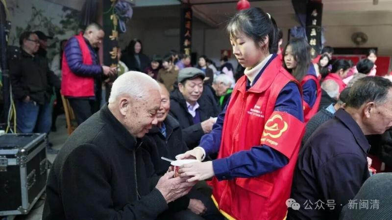 活动现场。 活动以“福粥飘香承习俗 孝行相伴润家风”为主题,活动中,家风故事分享、集体朗诵、独唱《送给你》等精彩节目轮番上演,旗袍秀、闽清童谣、小品等表演将氛围推向高潮,志愿者还为现场老人送上拗九粥、伴手礼与平安扣,义诊、义剪等文明实践活动同步开展,让老人们尽享温情,国网闽清县供电公司工作人员还向现场老人宣传用电安全知识。