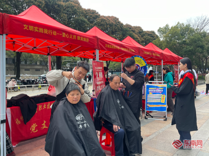 志愿者为老人理发。 现场还设置了“学雷锋·文明实践我行动”敬老便民服务文明实践集市,12个特色便民摊位为老年居民提供一站式贴心服务。拓福、漆扇DIY等非遗体验,让大家感受传统手工艺的独特魅力;医护人员提供号脉、推拿、口腔检查等健康服务;志愿者为老人义剪、更换手机贴膜,用点滴行动传递温暖。