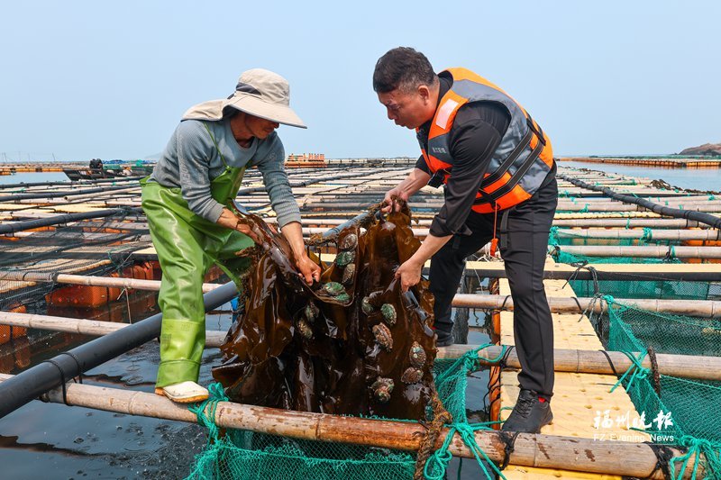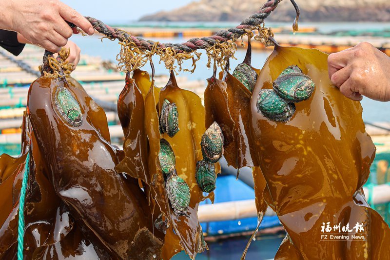 渔民采收鲍鱼。 上面养海带,中间养鲍鱼,下面养鱼类,实现立体化养殖。眼下,连江“叠叠乐”养殖的海产品迎来丰收季。 近日,在筱埕镇定海村海域,连片的塑胶渔排铺展在碧波之上,养殖户们将开放式“别墅型”鲍鱼网箱缓缓提出水面,娴熟地采收着鲜活肥美的鲍鱼。 “与传统抽屉式鲍笼相比,开放式‘别墅型’鲍鱼网箱具有空间宽敞、水流通畅等优势,能够有效提升鲍鱼的成活率、生长速度和品质。”福州日兴水产食品有限公司董事长江铭福说,“我们将整根海带挂在网箱上方,让海带自然生长,既能持续净化水质、改善养殖环境,又能让鲍鱼自由摄食新鲜的海带叶片,实现生态养殖。” “我们采用立体养殖模式,在下层水体养殖真鲷、包公鱼、石斑鱼等多种海鱼。其中,石斑鱼等鱼类还能充当‘清洁卫士’,摄食清除藤壶等网衣附着物,保持网箱洁净。”养殖户连胜利说,这种“叠叠乐”养殖模式可以节省不少投喂、清网的人力、物力成本,鲍鱼产量也较以往提高了约四分之一。