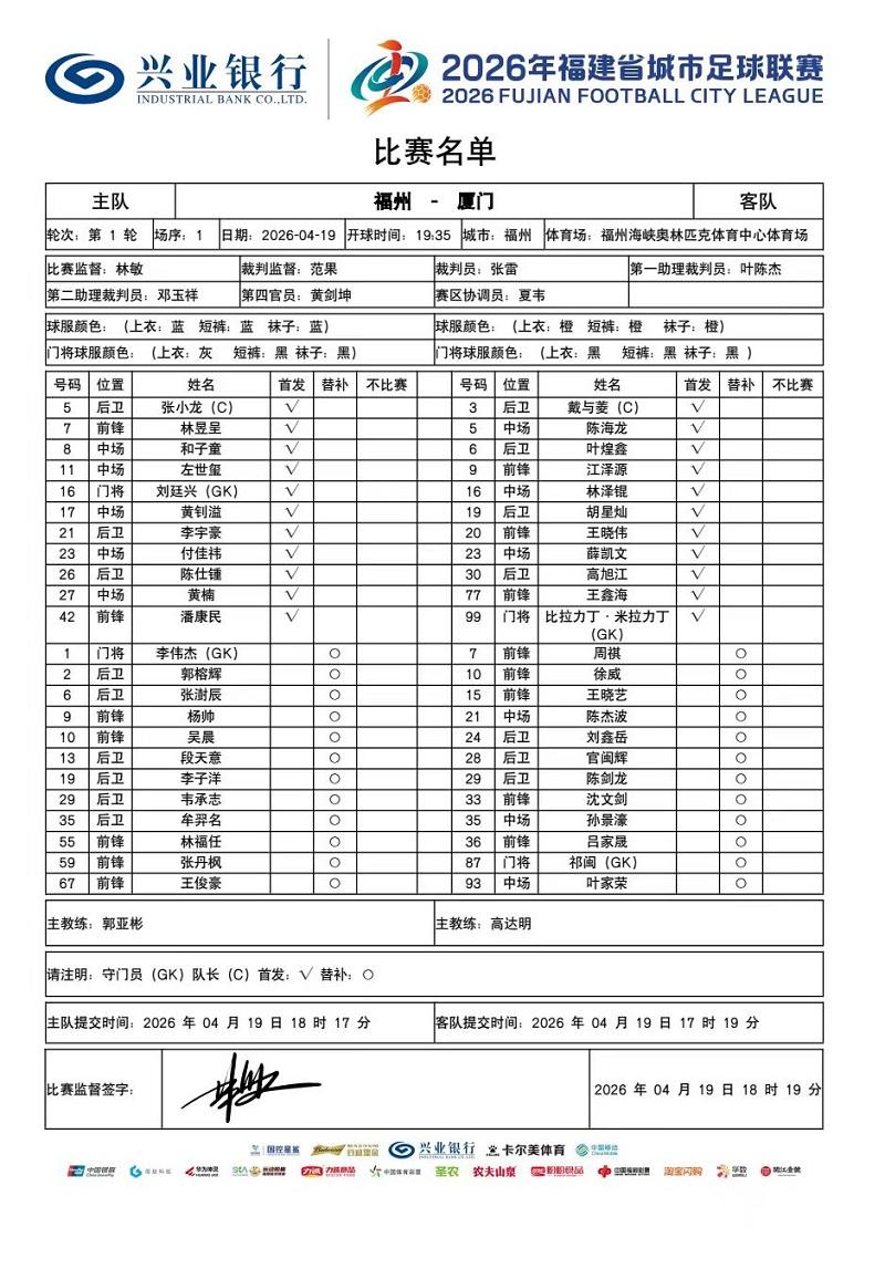 2026年福建省城市足球联赛(简称“闽超”)即将开哨之际,福州队与厦门队首发名单正式公布,两支队伍尽遣主力,全力冲击揭幕战开门红。