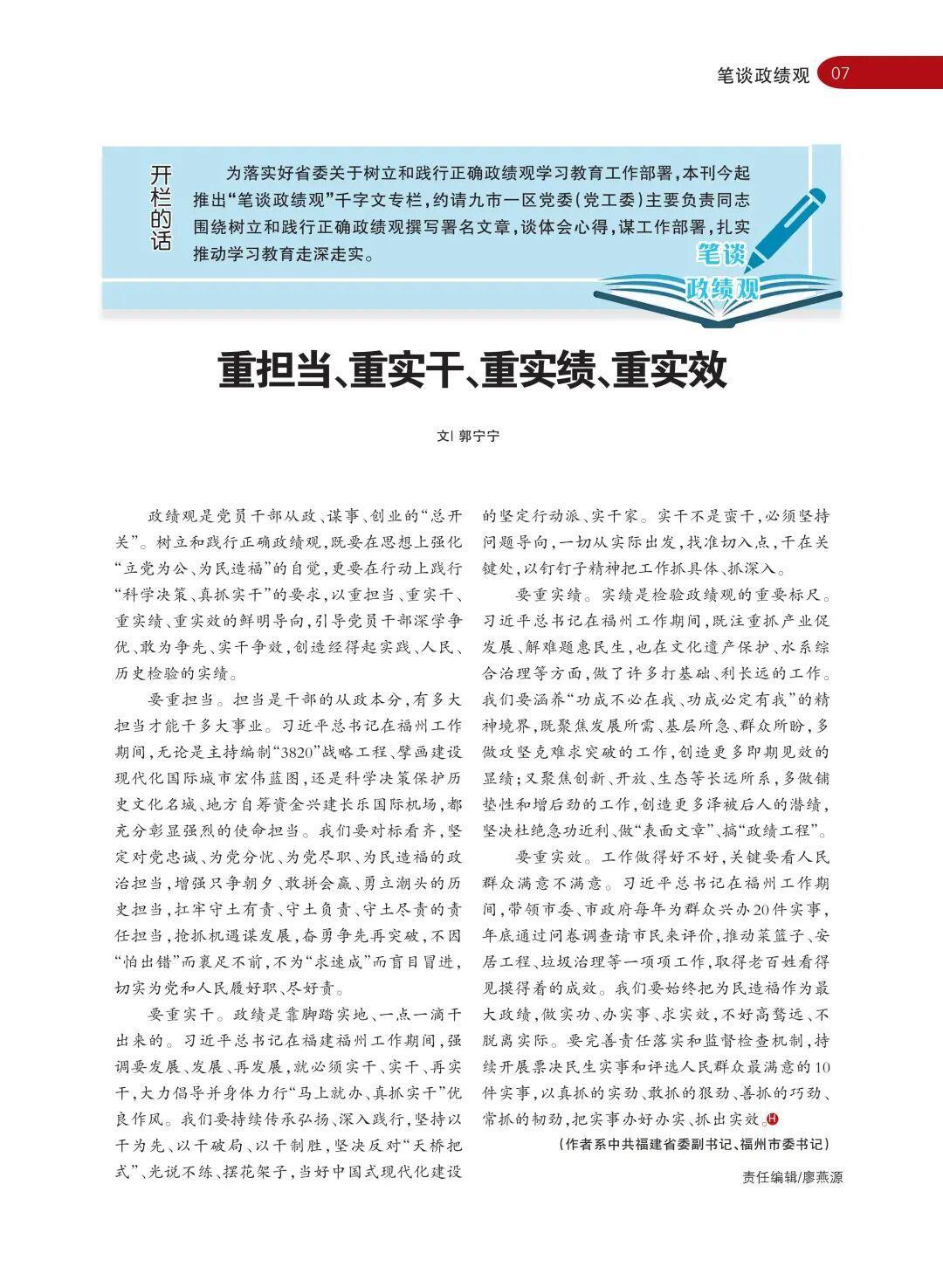 重担当、重实干、重实绩、重实效 政绩观是党员干部从政、谋事、创业的“总开关”。树立和践行正确政绩观,既要在思想上强化“立党为公、为民造福”的自觉,更要在行动上践行“科学决策、真抓实干”的要求,以重担当、重实干、重实绩、重实效的鲜明导向,引导党员干部深学争优、敢为争先、实干争效,创造经得起实践、人民、历史检验的实绩。 要重担当。担当是干部的从政本分,有多大担当才能干多大事业。习近平总书记在福州工作期间,无论是主持编制“3820”战略工程、擘画建设现代化国际城市宏伟蓝图,还是科学决策保护历史文化名城、地方自筹资金兴建长乐国际机场,都充分彰显强烈的使命担当。我们要对标看齐,坚定对党忠诚、为党分忧、为党尽职、为民造福的政治担当,增强只争朝夕、敢拼会赢、勇立潮头的历史担当,扛牢守土有责、守土负责、守土尽责的责任担当,抢抓机遇谋发展,奋勇争先再突破,不因“怕出错”而裹足不前,不为“求速成”而盲目冒进,切实为党和人民履好职、尽好责。 要重实干。政绩是靠脚踏实地、一点一滴干出来的。习近平总书记在福建福州工作期间,强调要发展、发展、再发展,就必须实干、实干、再实干,大力倡导并身体力行“马上就办、真抓实干”优良作风。我们要持续传承弘扬、深入践行,坚持以干为先、以干破局、以干制胜,坚决反对“天桥把式”、光说不练、摆花架子,当好中国式现代化建设的坚定行动派、实干家。实干不是蛮干,必须坚持问题导向,一切从实际出发,找准切入点,干在关键处,以钉钉子精神把工作抓具体、抓深入。 要重实绩。实绩是检验政绩观的重要标尺。习近平总书记在福州工作期间,既注重抓产业促发展、解难题惠民生,也在文化遗产保护、水系综合治理等方面,做了许多打基础、利长远的工作。我们要涵养“功成不必在我、功成必定有我”的精神境界,既聚焦发展所需、基层所急、群众所盼,多做攻坚克难求突破的工作,创造更多即期见效的显绩;又聚焦创新、开放、生态等长远所系,多做铺垫性和增后劲的工作,创造更多泽被后人的潜绩,坚决杜绝急功近利、做“表面文章”、搞“政绩工程”。 要重实效。工作做得好不好,关键要看人民群众满意不满意。习近平总书记在福州工作期间,带领市委、市政府每年为群众兴办20件实事,年底通过问卷调查请市民来评价,推动菜篮子、安居工程、垃圾治理等一项项工作,取得老百姓看得见摸得着的成效。我们要始终把为民造福作为最大政绩,做实功、办实事、求实效,不好高骛远、不脱离实际。要完善责任落实和监督检查机制,持续开展票决民生实事和评选人民群众最满意的10件实事,以真抓的实劲、敢抓的狠劲、善抓的巧劲、常抓的韧劲,把实事办好办实、抓出实效。 (作者系中共福建省委副书记、福州市委书记) |