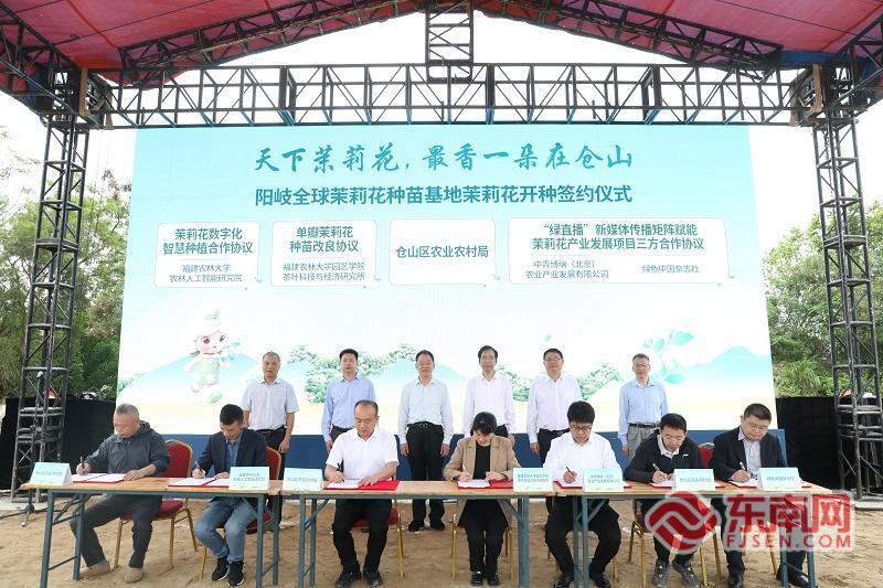 基地效果图。 活动现场,福建农林大学叶乃兴教授发布福州单瓣茉莉花与全国主栽种双瓣茉莉花高质量基因组,为茉莉花种质资源保护、品种改良与产业创新发展提供了重要科技支撑。 仪式上,仓山区农业农村局分别与福建农林大学园艺学院茶叶科技与经济研究所签订单瓣茉莉花种苗改良合作协议,与福建农林大学农林人工智能研究院签订茉莉花数字化智慧种植合作协议,并联合中青博纳(北京)农业产业发展有限公司、绿色中国杂志社签订“绿直播”新媒体传播矩阵赋能茉莉花产业发展三方合作协议,以政校企深度协同,为产业发展注入科技、数字、传播新动能。