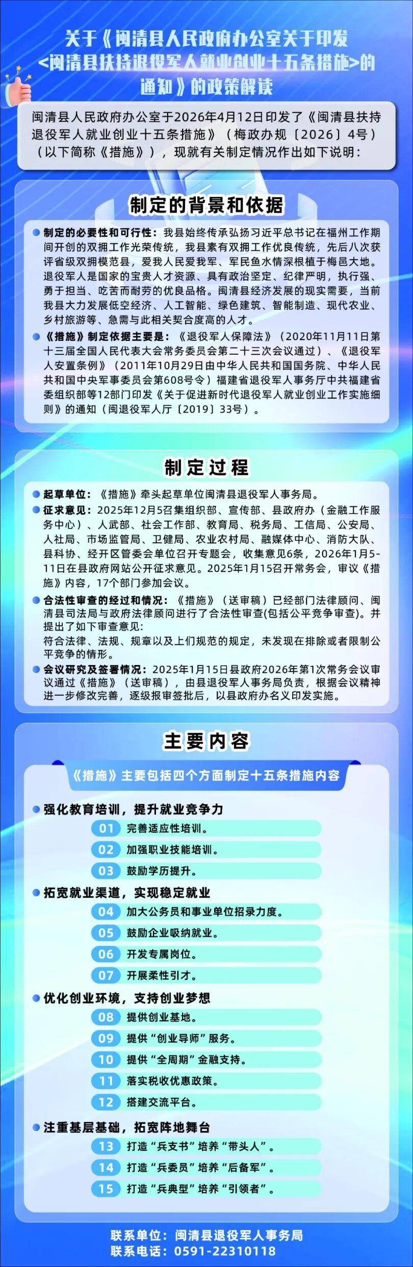 日前,闽清县人民政府办公室发布《闽清县扶持退役军人就业创业十五条措施》,为退役军人在闽清施展才华、安居乐业提供全方位多层次的坚实保障。
