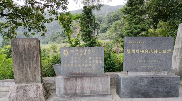 墓群广场上的区、省和国家级保护碑。记者 欧阳进权 摄 福州日报记者 欧阳进权 说到船政,两个人不能不提,一人是左宗棠,另一人是沈葆桢,今年是首任船政大臣沈葆桢诞辰200周年。与沈葆桢一样流芳百世的还有忠骨埋于闽安虎头山的135位清兵。这些将士随沈葆桢援台御敌,归葬于此,这里也被列为全国重点文物保护单位。 如今,福州戍守台湾将士墓群成为大家凭吊当年为国捐躯、保卫我国领土英雄们的场所。每逢清明等节假日,闽安当地学生、驻地部队官兵及海峡两岸社会各界人士,会在这里举行纪念活动。1日和7日,记者两次来到这里,均看到有人打理墓群。 这个独特墓群,反映了闽台血脉同宗、共同抵御外敌的民族精神。它是闽台关系的重要见证,体现铁一般的事实:中国自古拥有对台湾的主权地位,台湾自古属于中国的固有领土。 发现档案 福州戍守台湾将士墓群(又称虎头山义冢),位于马尾区亭江镇闽安村虎头山。清同治甲戌年(1874年)日军进攻台湾时,随沈葆桢援台御敌阵亡或染瘴疫病死的将士,归葬于此。土坑竖穴墓,坐西南向东北,一面依山,三面临溪涧山谷。墓坪用三合土夯筑。义冢面宽13米,纵深11.5米。冢内埋135位清兵遗骸,每位一圹,排列井然,横13行,直11行,各墓距离相等,均用三合土封顶。封土堆前各立一小墓碑,高0.37米,宽0.24米,厚0.08米,上刻死者籍贯及姓名。冢前立一石碑,高0.85米,宽0.42米,上刻楷书“义冢,同治岁次甲戌冬十月吉日立”,是我国唯一一处将阵亡将士的籍贯、姓名单独列碑的墓群。 1992年福州市郊区政府将其公布为第二批区级文物保护单位。2009年由福建省政府公布为第七批省级文物保护单位。2013年由国务院公布为第七批全国重点文物保护单位。