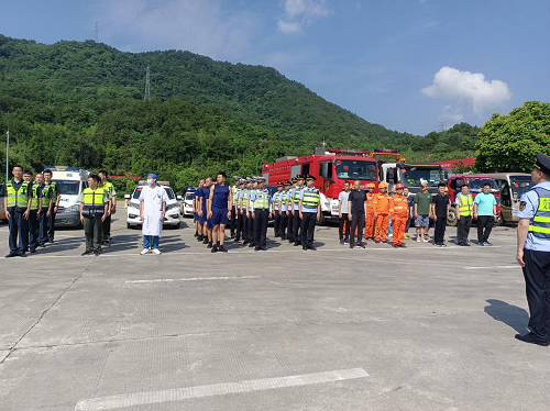 演练集结。福州高速执法支队 供图 今年6月是全国第22个“安全生产月”,主题为“人人讲安全 个个会应急”。根据省厅及省交通保障中心“安全生产月”活动方案及2023年福建省交通运输安全生产工作重点整治13项行动中的“高速公路隧道突发事件应急处置能力提升行动”,此次模拟事故地点位于福州京台高速天龙山隧道内(往古田方向)。京台高速(福州段)全程52.9公里,其中六千米以上特长隧道3座,桥隧占比高达49%。福州京台高速也是危化品车辆往北运输的主要通道,高速公路安全管理工作可谓重中之重。