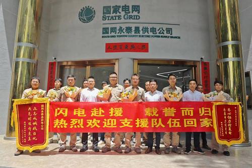 支援保电队伍凯旋归来。许琳娴 摄 台风“杜苏芮”在福建泉州晋江市沿海登陆,泉州、莆田多地出现不同程度的受灾,对电网运行和供电保障造成较大影响。一方有难,八方支援。国网永泰县供电公司先后派出2支共产党员突击队赶赴莆田仙游、泉州泉港支援抢险,在此次抢修中,共产党员突击队当先锋、作表率,战斗在一线前沿,在急难险重前勇于担当,在抗击台风筑牢红色堡垒,让鲜红党旗飘扬在防抗台风抢修保电第一线。 7月25日,该公司党员突击队主动请战,在台风登陆前组成29人次的抗击“杜苏芮”台风跨区支援队赶赴漳州,后转战莆田仙游。7月31日,继驰援莆田后第二次吹响集结号,又火速集结19人次防抗台风保电支援队伍,跨区支援泉州泉港抗台风保供电及电网抢修工作。 连日来,该公司跨区支援抢险队伍争分夺秒、昼夜不停鏖战抢修,克服台风过境后带来的持续的雷雨天气,以及道路受阻、通信不畅、施工困难等问题,全力以赴投入到抢修复电中。据统计,此次跨区抢修共恢复了5条10千伏主干线9条支线,58个台区的供电,为5006户群众送来“光明”。