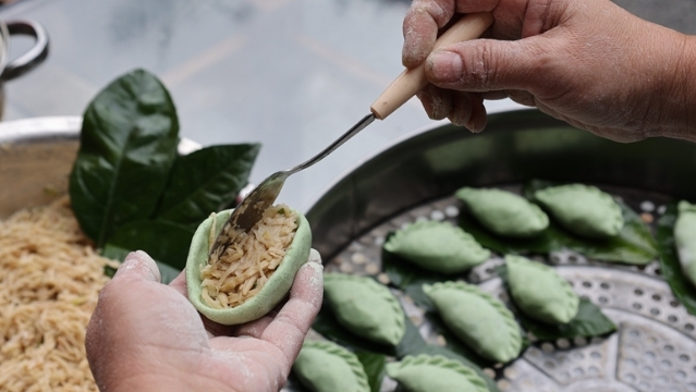 馅料有红豆和萝卜丝 眼下,这里家家户户都忙着制作“三月三”特色美食——清明粿。清明粿又称菠菠粿、青团等,以鼠曲草(菠菠草)或艾草为原料,混合糯米制成黄绿色的粿皮,裹上用红豆和萝卜丝混合制成的馅。 除了清明粿,这里的畲民还会用艾草制作另一种特色美食——香甜软糯的艾草饼。 闽台饮食文化同根同源。据《闽菜史谈》记载,清明粿制作历史悠久,是福州等地的特色小吃。如今,清明粿已入选第一批闽菜保护名录(“风味小吃”类),成为了增进两岸同胞感情的重要载体。 每年清明节前后,两岸少数民族同胞都会将祭祀祖先、吃清明粿等民俗作为重要活动。在马祖澳两岸,流传着“真鸟仔,啄菠菠(鼠曲草),三岁妮仔会唱歌”的童谣。(记者 郑瑞洋通讯员 连融媒 陈成志 文/摄) |