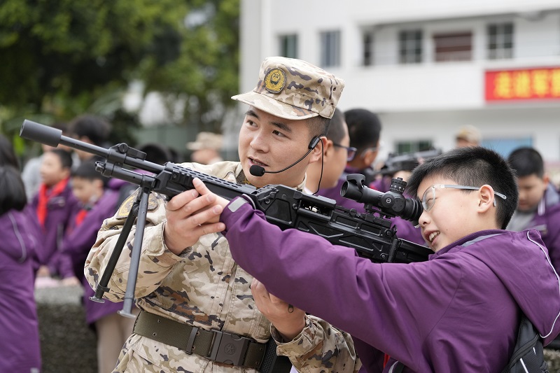 武器装备体验。武警福州支队供图 在特种装备展示环节,特战队员向师生逐一介绍特种装备的功能和基本操作方法,学生们跃跃欲试,在官兵们手把手的指导下,认真学习据枪、瞄准等动作,亲身体验军事装备的魅力。五年级5班的吴佳橦兴奋地说道:“今天摸到真正的狙击步枪特别激动!武警叔叔教我们‘三点一线’瞄准方法,枪托抵肩时感觉整个身子都在抖。现在知道军人叔叔每天要扛这么多装备训练,特别佩服他们。”