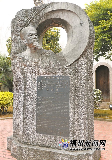 “林则徐星”雕塑。 陈建生院士的项目组先后发现了1400多颗小行星,在世界天文台排行榜上名列第四。1996年6月7日,项目组发现了一颗小行星。项目组和北京天文台朱进博士,提议将这颗小行星命名为“林则徐星”。 林则徐的禁毒和治水业绩,得到了国际社会的公认,因此国际小天体命名委员会批准了中科院的建议。“林则徐星”在火星与木星之间,沿椭圆轨道以4.11年的周期绕太阳运动。 3、最牛的校庆献礼——福州格致星
