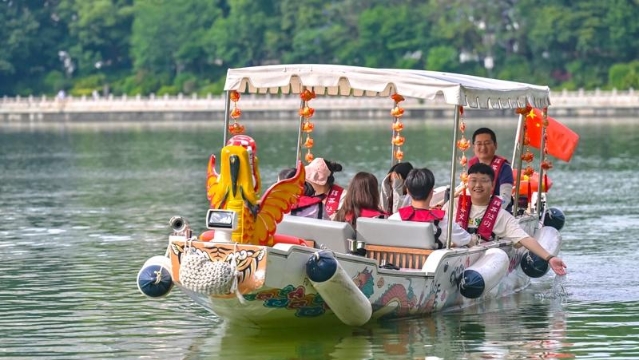 龙舟游船行驶在景色秀丽的福州西湖。 近年来,在福州市各部门的通力配合下,福州水务集团所属福州水务文旅有限公司持续深入打造品牌,“福舟悠游”内河游特色文旅品牌人气指数持续上升,在福州文旅市场上闯出一片天地。